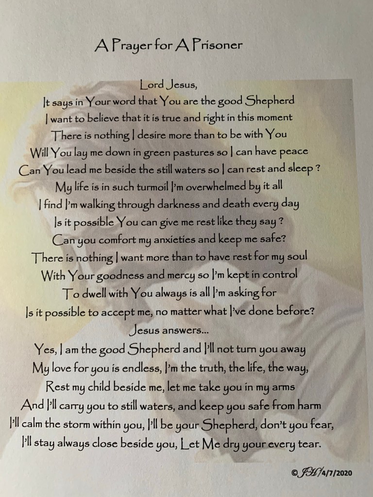 In the last few months I have been corresponding with a lady in prison and the Lord has put on my heart to send her this prayer…I titled it, A Prisoners Prayer. I wanted to share it with you as well that no matter where you’re at or what you’ve done Jesus loves you and longs for you to draw close to Him. Love and prayers, Jan (Lollita Faith) 🙏🏻❤️