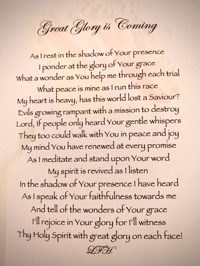 As I spent time with the Lord I felt such a strong presence of His peace surround me flowing throughout my whole being. In those moments it was like Psalms 91 had engraved its song upon my heart and mind. What a beautiful promise of protection over His people that dwell in the secret place of His presence. I pondered at the glory of His grace on my life and His faithful love and mercy as He has carried me through each trial. Then my heart became heavy for the world for it is so badly affected by the enemy and all his evil deeds. Then the Lord revealed to me to speak of His faithfulness and tell of the wonders of His grace and to rejoice in His glory for I’ll witness the Holy Spirit with great glory on each face. The Lord then gave me the scripture in Romans 8:18 (For I consider that the sufferings of this present time are not worthy to be compared with the glory that is to be revealed to us.) I believe even in the midst of evil times that rage in this world round about us, there is truly a great glory that is coming for the whole world to see. Our minds cannot fathom or even understand what is yet to be, but our God shines hope within our hearts and awakens our spirits to see beyond what the world sees at this present time. There is an all knowing in the depths of our soul that greater things are about to take place. I believe we have no need to fear but get excited for this great glory coming will save our lost loved ones and set captives freer than free!!! I believe we will see a mighty outpouring of the Holy Spirit like never before. I can’t even describe all that’s about to take place, but I do know it’s coming soon. Don’t give up hope in our God who is alive, for Jesus died with passion for a purpose and we have yet to see the end results of His miraculous resurrection.