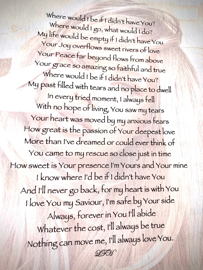 In 2012 as I meditated on Psalm 121 I was inspired to write the poem, Where Would I Be if I Didn’t Have You? I pray this word will encourage you and know you are loved, Love Jan (Lollita Faith)