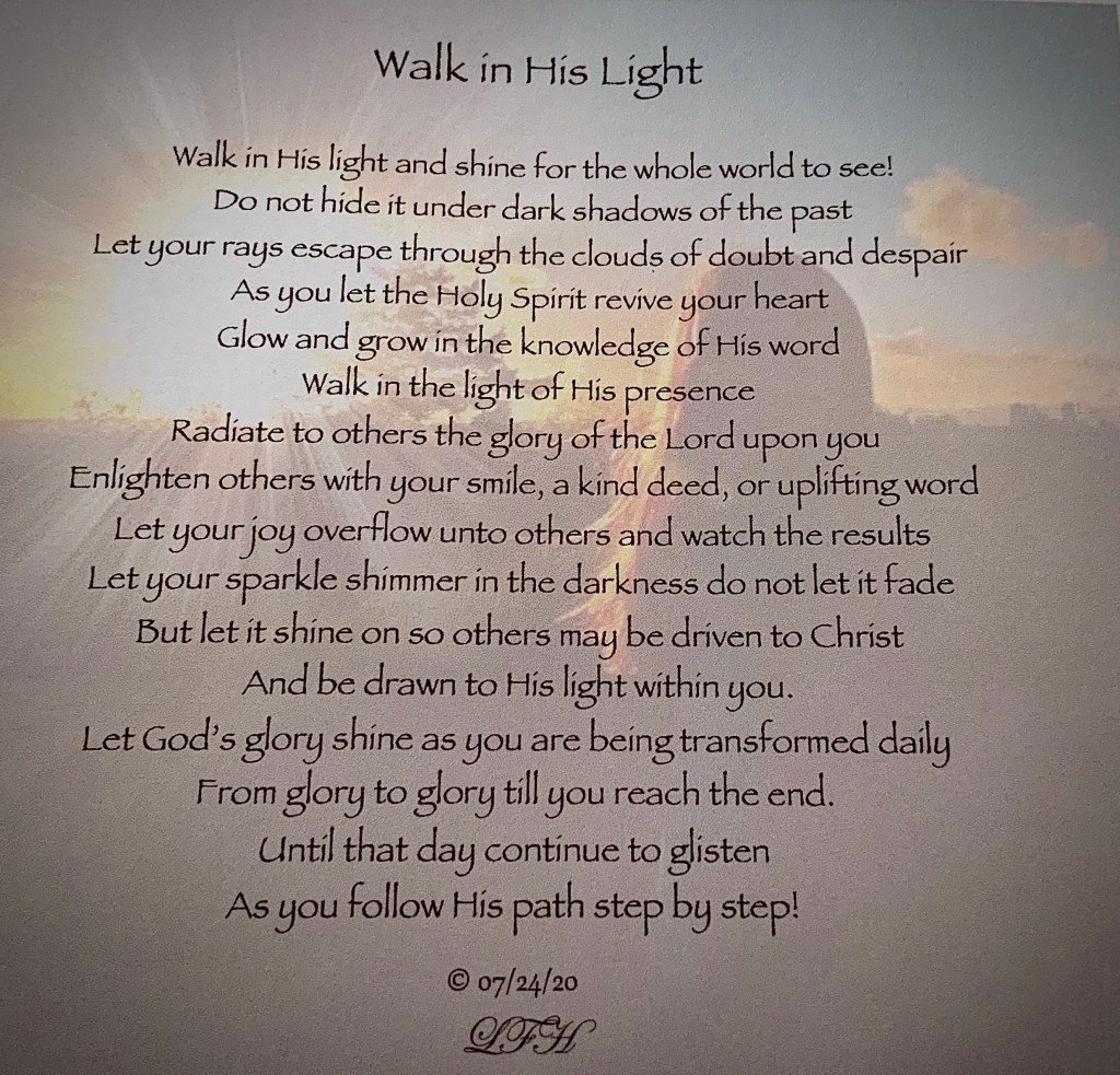 When we go to turn on a light switch, we have faith that it will light up the room. Why is it people can have faith in a light bulb and not faith in the Light of God? With faith in God He can light up our world and as we walk in the light of His presence, we receive joy, peace, and enriched spiritual fulfillment in Christ, just as His word says. There is no other way of walking if you want to live a joyful life and when you do, you experience His peace beyond any other. As you walk… you work towards His goals, that He has assigned for you! There is so much in God’s word about His light and tells of many other benefits, but we first need to keep focused on Him and walk in the spirit not in the flesh. The Holy Spirit will lead and guide you step by step each day to accomplish the Father’s will, so walk in His light and watch the glorious outcome you will experience on a daily basis. I love Matthew 5:14,16 where it says we are the light of the world, so let our lights shine for men and women to see our good works and glorify our Father in heaven. I challenge you to look up all the scriptures that mention His Light and enjoy the journey!
