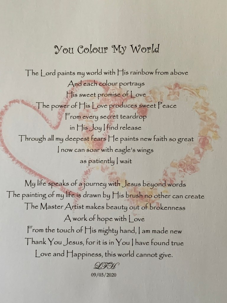 Colour My World. My dream was to have someone colour my world but instead there was nothing but darkness, and my life was an empty page. The words were meaningless at the time compared to the life I now live. There is nothing in this world that could ever take the place of Jesus in my life. He has beautifully coloured my portrait beyond my every dream and adds more colour every day with the beauty of His love and grace and His glory shimmers and shines for the whole world to see…If you are searching for answers to your dreams, surrender it all to Him and He will do greater things than you could ever imagine right now.