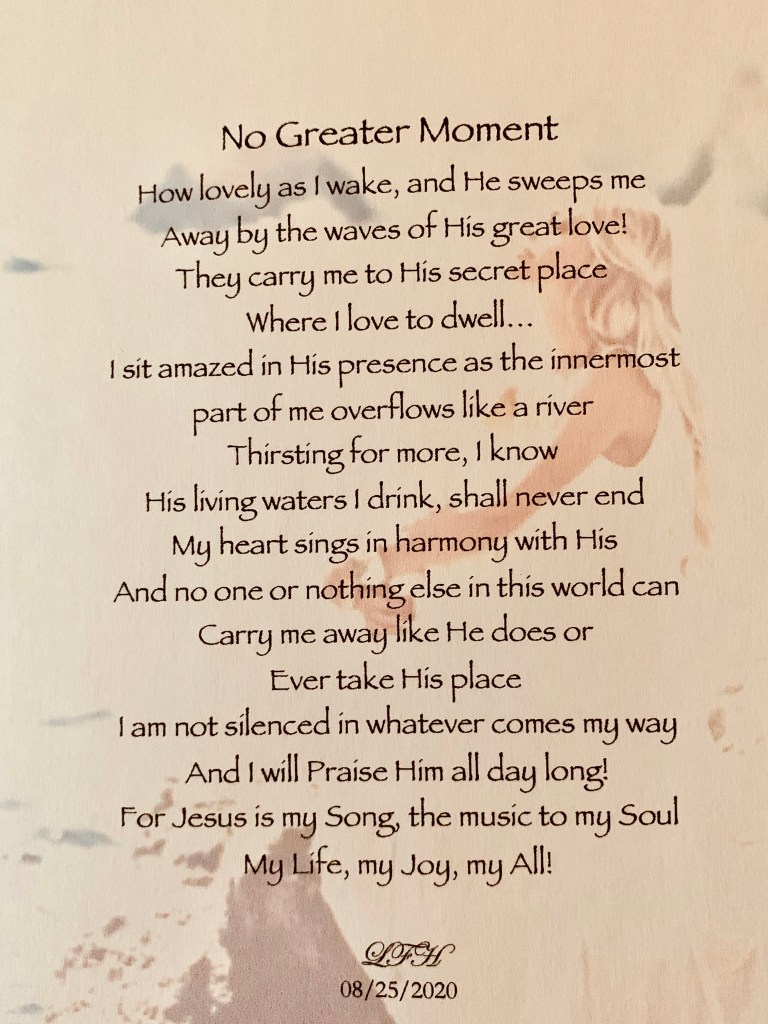 I love my moments in the morning, with my Lord and Saviour, Jesus. He has me captured by His presence and when I am caught up in Him, there is fullness of joy. He renews, refreshes, revives, and empowers me to take on whatever comes my way. My heart overflows with praises, moment by moment throughout the day. By the evening I reflect and rejoice in His faithfulness. He is truly, amazing, and worthy to be praised for His excellent greatness, overflowing mercy, and everlasting love. And I dearly love, and I am so grateful to the Holy Spirit for making it all possible. Let us make precious moments for Jesus every day and make them memorable for all eternity. My prayer is for the world to see Him for who He is and to experience His wonderful presence!