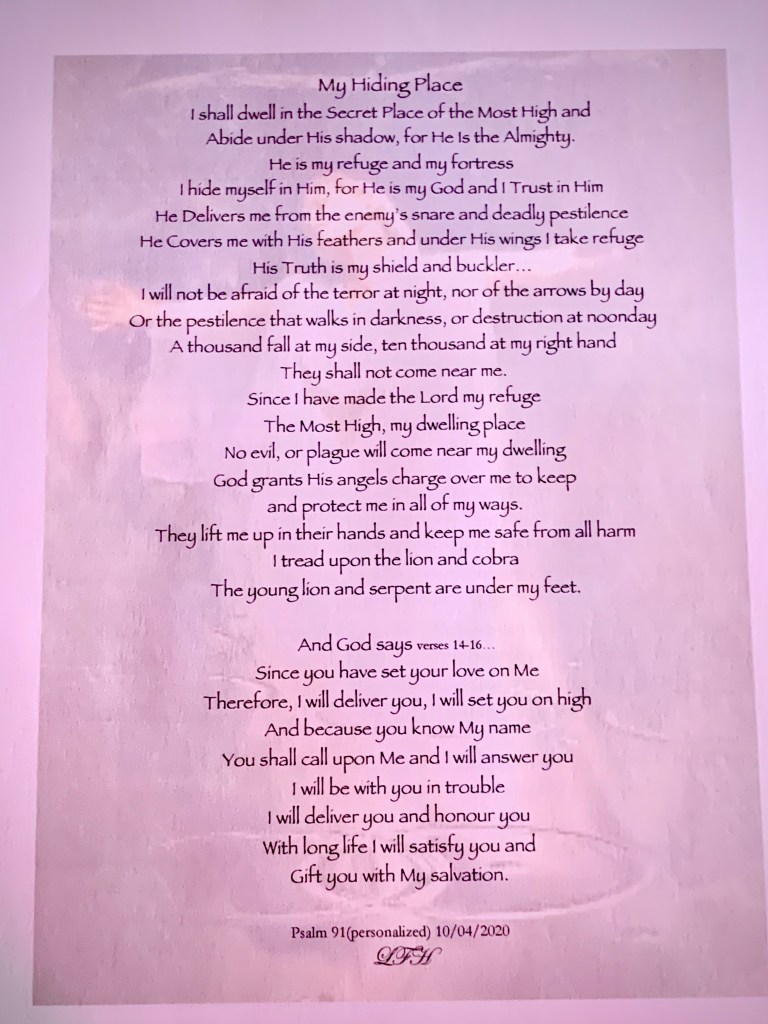 Hi everyone I wanted to share a little bit more about me, but I first want to thank you for following my blog. I appreciate everyone of you and you are all a great blessing and encouragement to me. Because of you my blog is a success and for that I thank you so much. Since 2014 I’ve been writing men and women in prison and sending them my poetry and prayers. Just a few days ago I received a message from a woman in prison and she asked me if I had a writing on Psalm 91. In the past I’ve written about the secret place but I haven’t personalized the whole chapter until today I sat down and here it is. I thank God and give Him all glory, for it is He that inspires me and I thought it would be nice to share it with you as well and I pray it will encourage you and remind you that you are loved. Love and blessings and prayers, Jan (Lollita Faith)