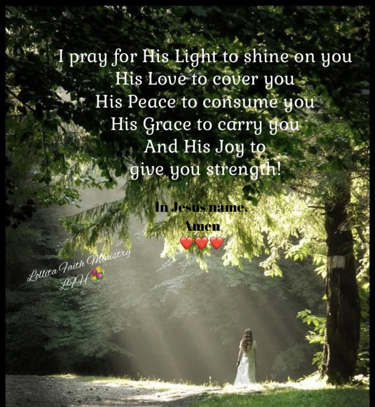I pray for His Light to shine on you, His Love to cover you, His Peace to consume you, His Grace to carry you, And His Joy to give you strength. In Jesus name, amen