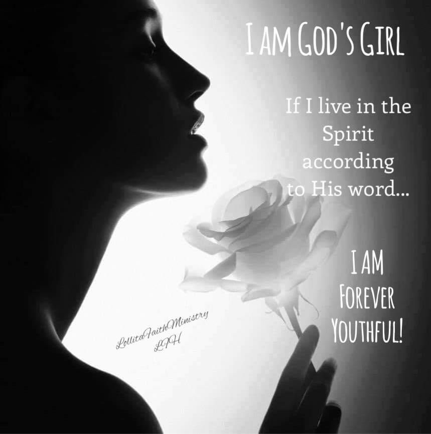 I Am God’s Girl 💕🌷 My eyes are the windows of my spirit. Look into my eyes deeply and you will see me youthful, fresh and flourishing as His vibrant girl, energized by Him shining with God’s glory. My heart is new and enlightened to see spiritual mysteries beyond the natural. I live, move and have my being within, for it is the Holy Spirit that overflows in me. I am who I am because of Him. I am not my own and I love the relationship we have together! He is the lover of my soul, my best Friend, my Counsellor, my Confidant, my Leader and Guide. He also is my Teacher and I learn from Him. He is alive and active in my life every moment. I am His vessel He flows through to enable me to worship, dance, and pray in the Spirit. He energizes me and enables me to fulfill His assignments.