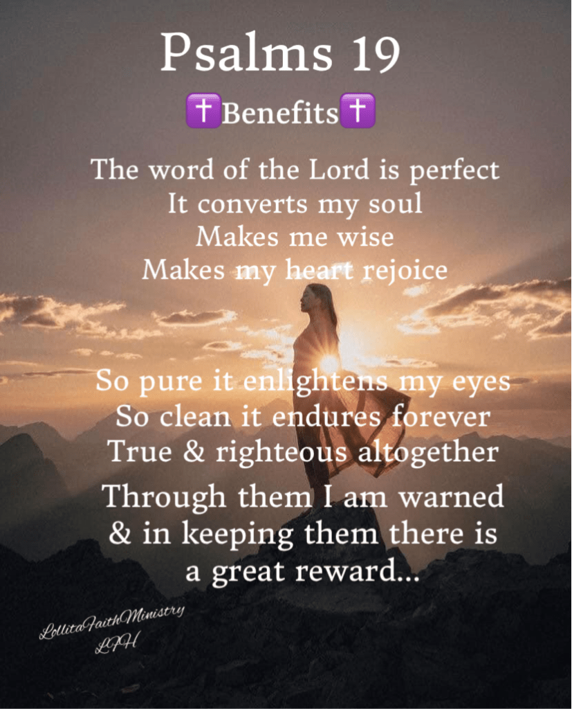 ✝️ The word of the Lord is perfect ✝️ It converts my soul. ✝️ Makes me wise. V 7 ✝️ Makes my heart rejoice ✝️ So pure it enlightens my eyes. V 8 ✝️ So clean it endures forever ✝️ True & righteous altogether V 9 ✝️ Through them I am warned and keeping them there’s a great reward. V 11
